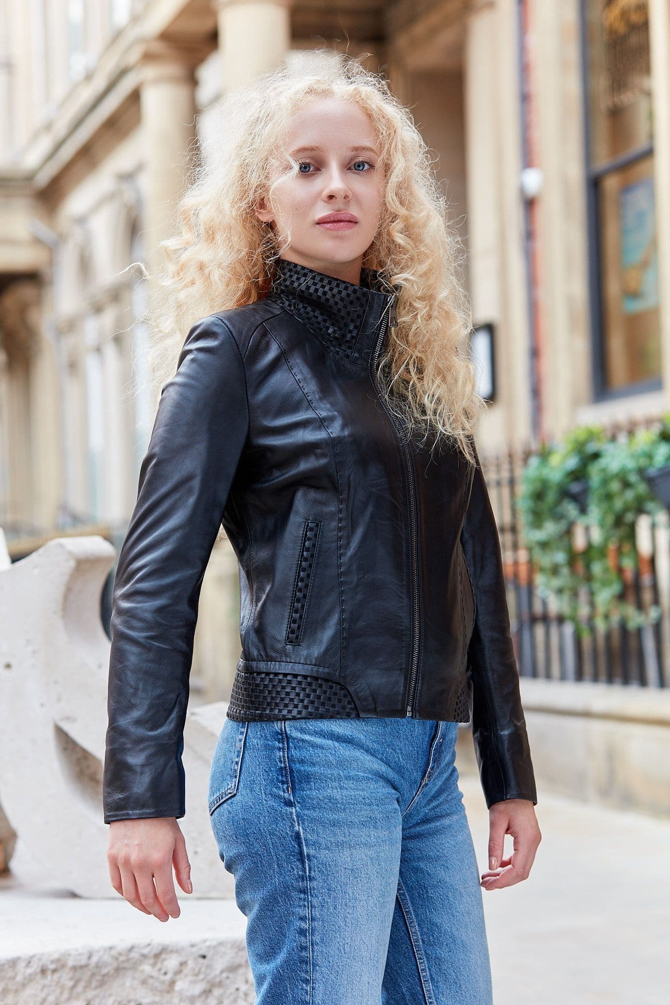 Intrecciato weave detailed short biker ladies jacket in black